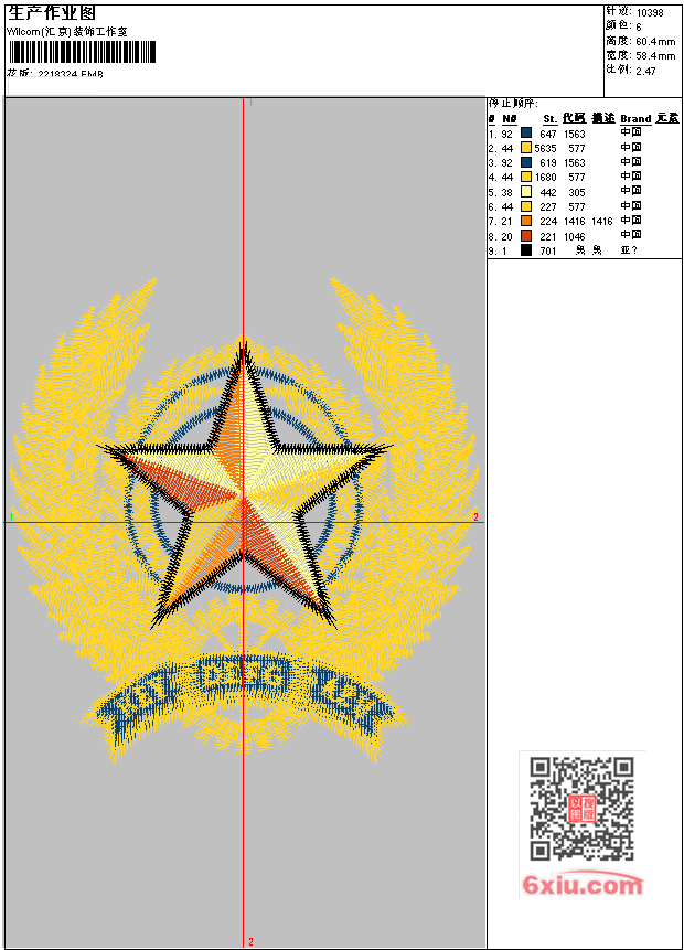 五角星臂章 EMB花版参数: 大小:124.00 KB / 尺寸:58*60[毫米] / 针数:10398针 / 线色:6 / 格式:EMB / 版本:e4.2 版带文件需绣花软件方可打开,可配色打印导出各种格式或直接上机绣。如无绣花软件可下载1:1模拟效果图。 PNG图片信息:大小:0.1(MB) /图宽*高:221x229(像素) EMB下载 1:1图下载 关闭 相关花版: 宝剑臂章 超级玛利 章仔 兔子 五角星 熊猫 花朵 库洛米 美乐蒂(贴布绣) 美乐蒂(贴布绣) 狗(贴布绣) 狗(贴布绣) 猫卡通 拉布布(贴布绣) 拉布布(贴布绣) 海绵宝宝 可爱熊熊章仔 小人抽象 脸 怪兽线条 怪兽 卡通 花朵小花缘边 枝条花藤汉服装饰边 裙头小花 票带 栀子花瓣 栀子花瓣 小飘带 花纹 祥云 梅花树枝 彼岸花背景大