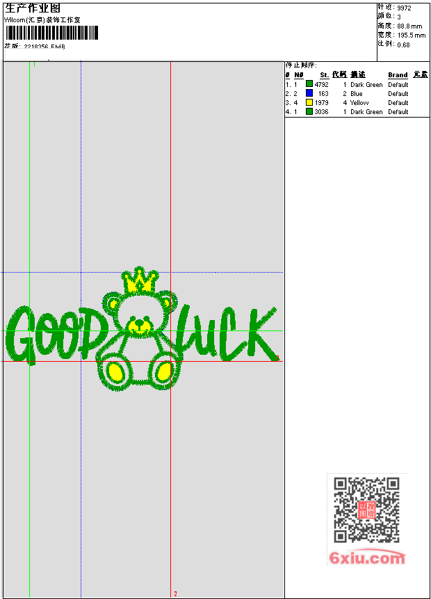 goodluck 熊 EMB花版参数: 大小:97.00 KB / 尺寸:196*89[毫米] / 针数:9972针 / 线色:3 / 格式:EMB / 版本:e4.2 版带文件需绣花软件方可打开,可配色打印导出各种格式或直接上机绣。如无绣花软件可下载1:1模拟效果图。 PNG图片信息:大小:0.2(MB) /图宽*高:740x336(像素) EMB下载 1:1图下载 收藏本图 关闭 相关花版: 熊大 KT猫 NEXRT generation KT猫 气球 小女孩 洛杉矶湖人队 帽子 蝴蝶 蜜蜂 五角星臂章 宝剑臂章 超级玛利 章仔 兔子 五角星 熊猫 花朵 库洛米 美乐蒂(贴布绣) 美乐蒂(贴布绣) 狗(贴布绣) 狗(贴布绣) 猫卡通 拉布布(贴布绣) 拉布布(贴布绣) 海绵宝宝 可爱熊熊章仔 小人抽象 脸 怪兽线条 怪兽 卡通 花朵小花缘边 枝条花藤汉服装饰边