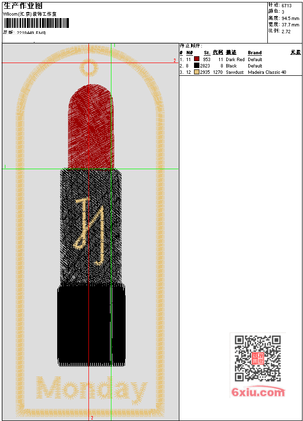 口红 EMB花版参数: 大小:57.00 KB / 尺寸:38*94[毫米] / 针数:6713针 / 线色:3 / 格式:EMB / 版本:e4.2 版带文件需绣花软件方可打开,可配色打印导出各种格式或直接上机绣。如无绣花软件可下载1:1模拟效果图。 PNG图片信息:大小:0.1(MB) /图宽*高:143x358(像素) EMB下载 1:1图下载 收藏本图 关闭 相关花版: 贴布绣兔子 罗小黑挂牌 欧式小枕 BEAR艺术字体 SHEEP艺术字体 龙宝宝 花 草莓 万圣节 南瓜 老鹰标 大象章子 史如比 蟾蜍 青蛙 仿十字绣 吐司 牡丹 猫咪 猫 小猫 奥特曼 龙 罗意威 战狼臂章 章仔 鹰 哪吒 小花 女孩 贴布 鸟 卡通 女孩书包
