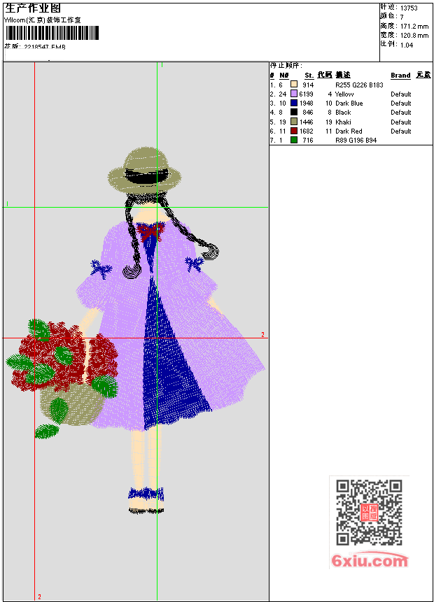 采草莓姑娘 EMB花版参数: 大小:112.50 KB / 尺寸:121*171[毫米] / 针数:13753针 / 线色:7 / 格式:EMB / 版本:e4.2 版带文件需绣花软件方可打开,可配色打印导出各种格式或直接上机绣。如无绣花软件可下载1:1模拟效果图。 PNG图片信息:大小:0.3(MB) /图宽*高:457x648(像素) EMB下载 1:1图下载 关闭 相关花版: 毛巾绣小狗 拉布布 Shirit-款 frankenskid 大象LONG 鱼排 千里江山 汽车内饰- 狗头卫衣 花鸟 花鸟 莲花圆 花环 大怪兽贴布绣 小熊坐车 保罗 米老鼠 太阳 口红 贴布绣兔子 罗小黑挂牌 欧式小枕 BEAR艺术字体 SHEEP艺术字体 龙宝宝 花 草莓 万圣节 南瓜 老鹰标 大象章子 史如比 蟾蜍 青蛙