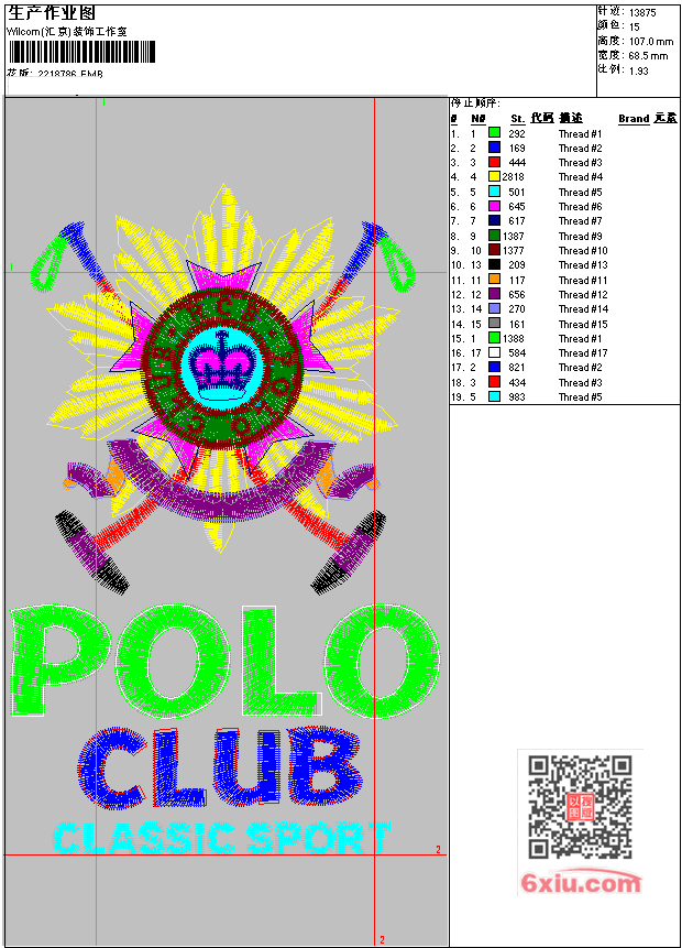 polo EMB花版参数: 大小:123.50 KB / 尺寸:68*107[毫米] / 针数:13875针 / 线色:15 / 格式:EMB / 版本:e4.2 版带文件需绣花软件方可打开,可配色打印导出各种格式或直接上机绣。如无绣花软件可下载1:1模拟效果图。 PNG图片信息:大小:0.1(MB) /图宽*高:260x405(像素) EMB下载 1:1图下载 收藏本图 关闭 相关花版: polo polo 章标 章标 章标 章标 野猪 章仔 孔雀花 服装花 小鸟 金鱼 花朵 玫瑰花 玫瑰花 开心 狗 史努比 厨师 狗 史努比 狗 史努比 画家 鬼章仔 手掌 南瓜怪 POLO小熊 天鹅 心型 polo 皇冠 polo polo 盾牌徽章 棉服徽章