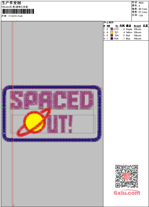 章 EMB花版参数: 大小:58.50 KB / 尺寸:87*50[毫米] / 针数:4929针 / 线色:4 / 格式:EMB / 版本:e4.2 版带文件需绣花软件方可打开,可配色打印导出各种格式或直接上机绣。如无绣花软件可下载1:1模拟效果图。 PNG图片信息:大小:0.1(MB) /图宽*高:331x188(像素) EMB下载 1:1图下载 收藏本图 关闭 相关花版: 花边 小猪佩奇 骷髅头 李宁 雪花 五角星珠片绣 熊毛巾绣 苹果毛巾绣 polo polo 小花 汉服 山羊孔雀 汉服 落花蝴蝶 汉服 花山背景墙 云肩 汉服裙子裙头 汉服裙子飘带 汉服飘带 孔雀 仙人掌 蝴蝶 鸟 猫头鹰 玫瑰花 猴子 猫头鹰 兔 猫头鹰 贴布女孩 皇冠