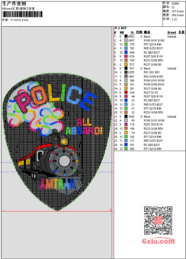 POLICE 火车 ALLABOARD AMTRAK EMB花版参数: 大小:159.50 KB / 尺寸:100*127[毫米] / 针数:22668针 / 线色:12 / 格式:EMB / 版本:e4.2 版带文件需绣花软件方可打开,可配色打印导出各种格式或直接上机绣。如无绣花软件可下载1:1模拟效果图。 模拟图片信息:大小:0.1(MB) /图宽*高:379x481(像素) EMB下载 1:1图下载 收藏本图 关闭 相关花版: 0303 AUSTINMOWER 老鹰-uncheck NEGOTIATOR ATLANTIC 马 独角兽 JEFFERSON POLICE DEPARTMENT BUFFALO 牛 SPACESYMP OKLAHOMA 火箭 爱心 小马 diao 小熊 熊 兔子 保罗 月亮熊 企鹅 保罗 花 保罗 polo 小马 爱心 蛋糕 铃铛 小熊 熊猫 猫头鹰 伞 猫 哆啦A梦 圣诞鹿 双马 章标 圆标