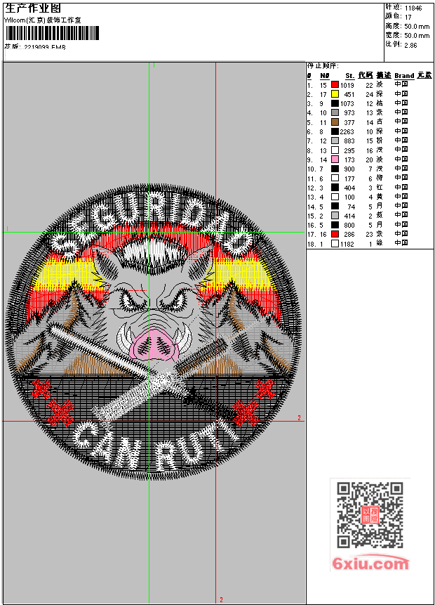 - EMB花版参数: 大小:147.00 KB / 尺寸:50*50[毫米] / 针数:11846针 / 线色:17 / 格式:EMB / 版本:e4.2