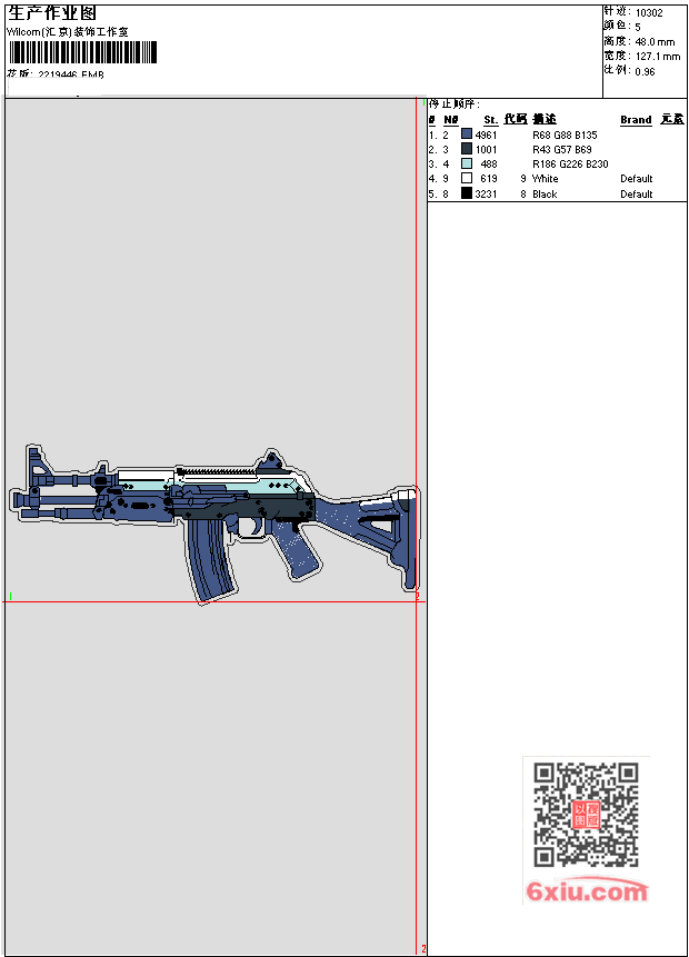 AK47 步枪 EMB花版参数: 大小:87.50 KB / 尺寸:127*48[毫米] / 针数:10302针 / 线色:5 / 格式:EMB / 版本:e4.2 版带文件需绣花软件方可打开,可配色打印导出各种格式或直接上机绣。如无绣花软件可下载1:1模拟效果图。 模拟图片信息:大小:0.1(MB) /图宽*高:481x182(像素) EMB下载 1:1图下载 收藏本图 关闭 相关花版: DAC 机车 骷髅 龙- 猫女 马赛克女孩 狮标 NTU 星河战士 海豹 SAVETHE 章仔 女神 羊头 章仔 鹰 鳄鱼 玫瑰 马 蝴蝶 33CM盘带棉格子布绣 章仔 章仔 章仔 章仔 章仔 章仔 被套 蓓蕾 B 校服 被套 被套 被套 小太阳 亮片 小猫 匹绣