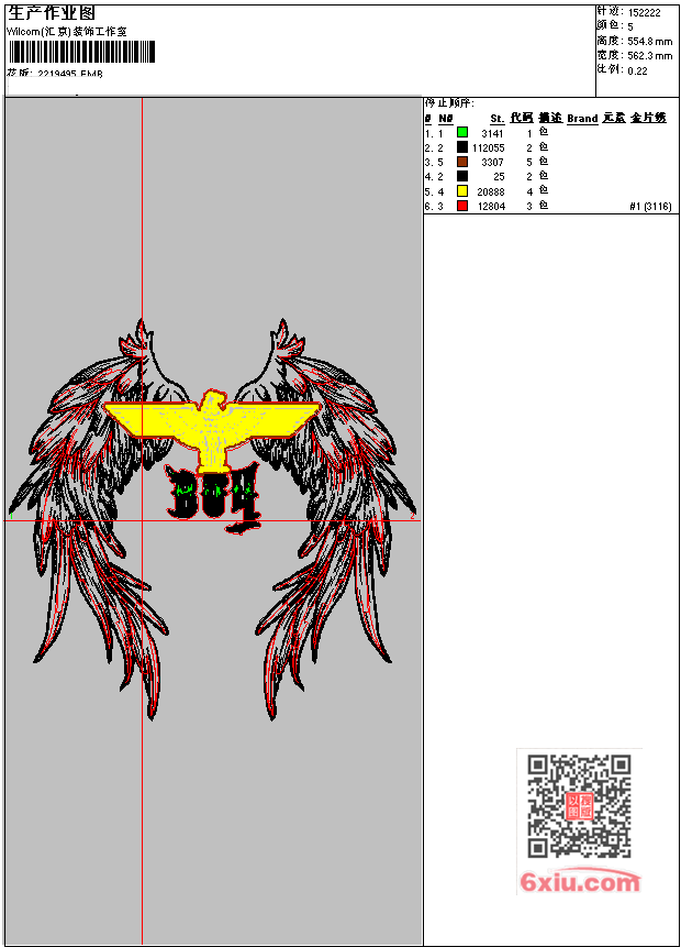 - EMB花版参数: 大小:1.09 MB / 尺寸:562*555[毫米] / 针数:152222针 / 线色:5 / 格式:EMB / 版本:e4.2