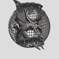 - 这是一张黑白的图片,图片中央是一个地球仪,地球仪上有一只海豚,海豚的嘴中叼着一根旗帜,旗帜上写着“新加坡空警”。地球仪的背景是网格状的,海豚的轮廓清晰,旗帜的边缘有轻微的阴影效果,整体设计简洁而富有象征意义。