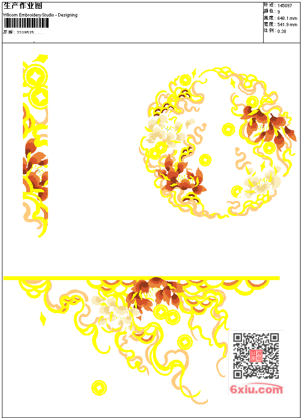 - EMB花版参数: 大小:781.50 KB / 尺寸:542*648[毫米] / 针数:145180针 / 线色:9 / 格式:EMB / 版本:e4.2