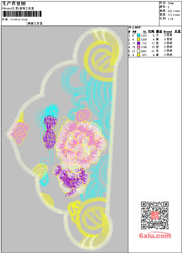 - EMB花版参数: 大小:98.50 KB / 尺寸:111*223[毫米] / 针数:7546针 / 线色:5 / 格式:EMB / 版本:e4.2