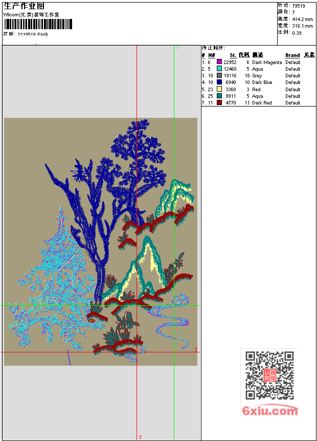 - EMB花版参数: 大小:3.76 MB / 尺寸:318*414[毫米] / 针数:79519针 / 线色:7 / 格式:EMB / 版本:e4.2