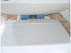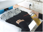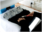 2.在发热板上加上一层布料(最好是白布),避免裁片直接接触发热板,以免被烧坏,再把有残留热熔胶的裁片放在上面受热几秒钟,注意要把残留热熔胶的裁片朝上,也就是绣花的底面。