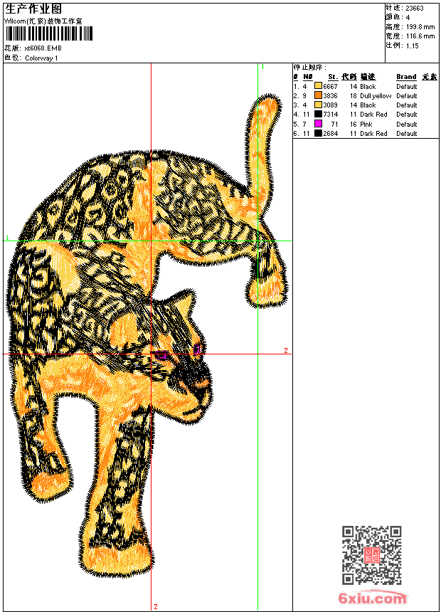 豹子 点此上传花版兑乐绣币/现金 emb花版参数: 大小:157.00 KB / 尺寸:117*200[毫米] / 针数:23663针 / 线色:4 / 格式:emb / 版本:9 版带文件需绣花软件方可打开,可配色打印导出各种格式或直接上机绣。如无绣花软件可下载1:1模拟效果图。 PNG图片信息:大小:0.4(MB) /图宽*高:441x756(像素) emb下载 1:1图下载 关闭 相似花版: 靓花 亮片范思哲 卡通evisu 老虎头 毛巾绣pow 毛巾绣蜘蛛侠动漫 毛巾绣动漫 毛巾绣漫画 卡通恐龙 小鸟 狼头标志 老虎头 猫 卡通形状 毛巾绣笑脸表情 卡通机器人 卡通机器人 仙鹤 范思哲 卡通动漫钢铁侠 上一个花样:金钱豹 下一个花样:靓花