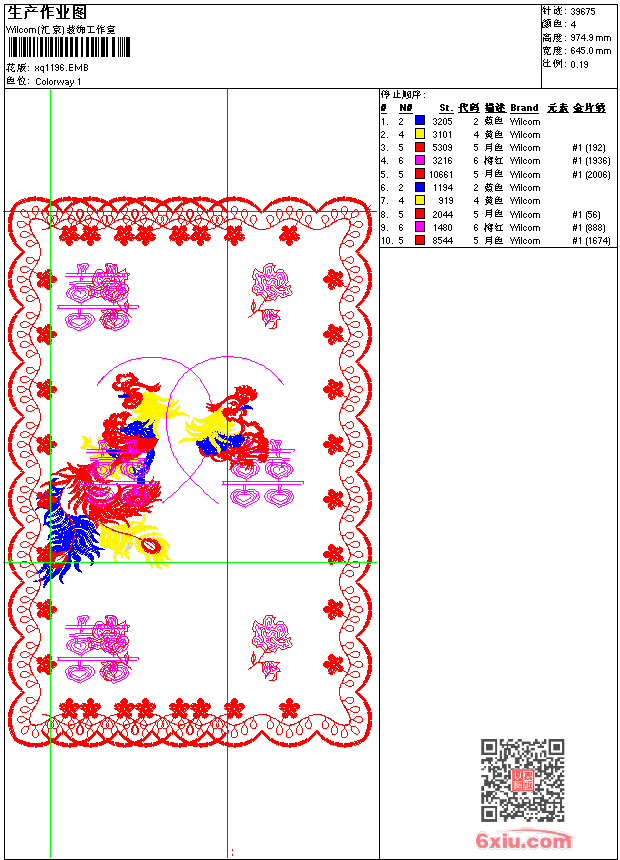 - emb花版参数: 大小:382.00 KB / 尺寸:645*975[毫米] / 针数:39675针 / 线色:4 / 格式:emb / 版本:9