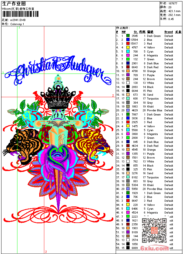 虎头 王冠 剑 章标 点此上传花版兑乐绣币/现金 emb花版参数: 大小:490.00 KB / 尺寸:282*423[毫米] / 针数:187677针 / 线色:20 / 格式:emb / 版本:9 版带文件需绣花软件方可打开,可配色打印导出各种格式或直接上机绣。如无绣花软件可下载1:1模拟效果图。 PNG图片信息:大小:2.0(MB) /图宽*高:1068x1601(像素) emb下载 1:1图下载 关闭 相似花版: 靓花 龙 凤凰 龙 凤凰 龙 鸟 福 龙 扇子 靓花 骷髅 鹰 鹰 龙 鲤鱼 龙 龙 龙 狮标 狮标 龙 上一个花样:虎头 下一个花样:靓花