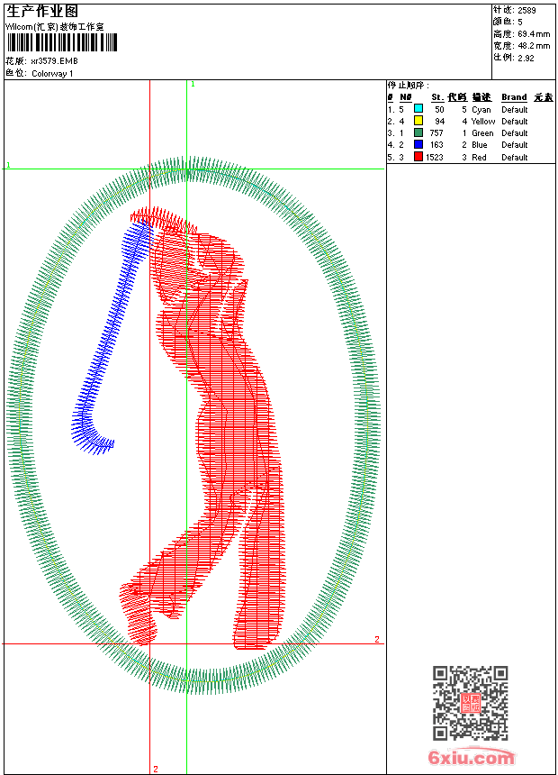 - emb花版参数: 大小:28.50 KB / 尺寸:48*69[毫米] / 针数:2589针 / 线色:5 / 格式:emb / 版本:9