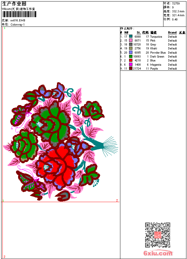 - emb花版参数: 大小:305.00 KB / 尺寸:321*332[毫米] / 针数:72759针 / 线色:9 / 格式:emb / 版本:9