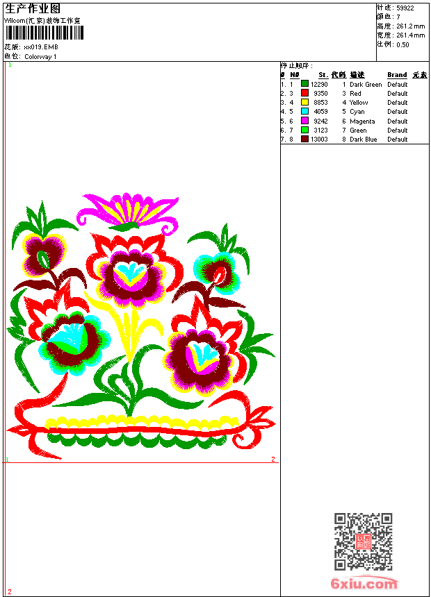 - emb花版参数: 大小:102.50 KB / 尺寸:261*261[毫米] / 针数:59922针 / 线色:7 / 格式:emb / 版本:9