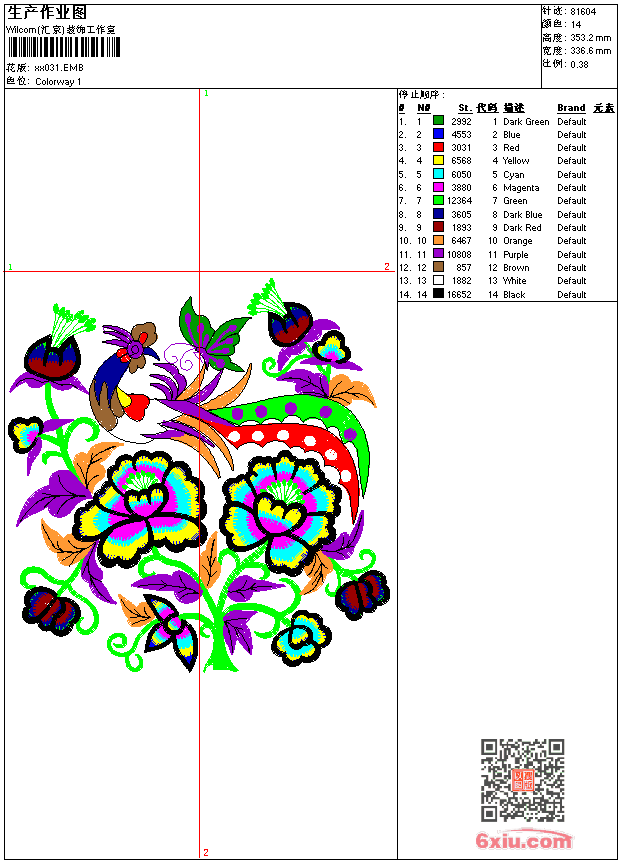 - emb花版参数: 大小:337.50 KB / 尺寸:337*353[毫米] / 针数:81604针 / 线色:14 / 格式:emb / 版本:9