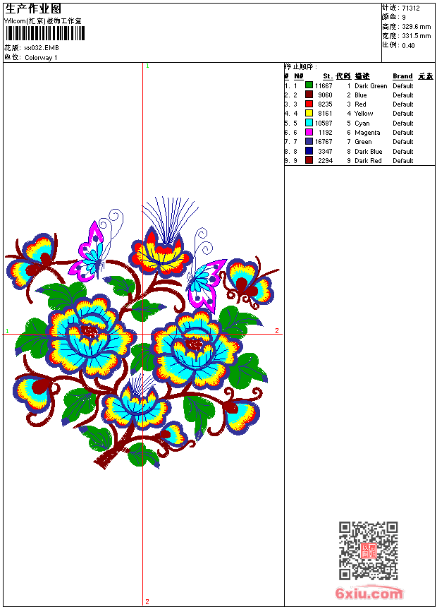 - emb花版参数: 大小:204.50 KB / 尺寸:332*330[毫米] / 针数:71312针 / 线色:9 / 格式:emb / 版本:9