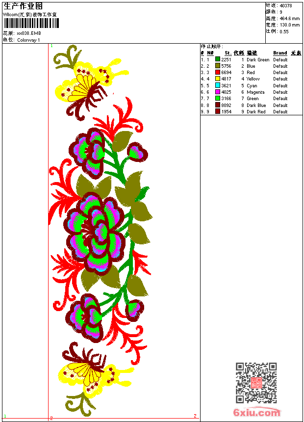 - emb花版参数: 大小:184.50 KB / 尺寸:130*465[毫米] / 针数:40378针 / 线色:9 / 格式:emb / 版本:9