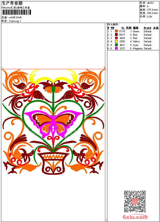 - emb花版参数: 大小:117.50 KB / 尺寸:269*276[毫米] / 针数:46791针 / 线色:6 / 格式:emb / 版本:9