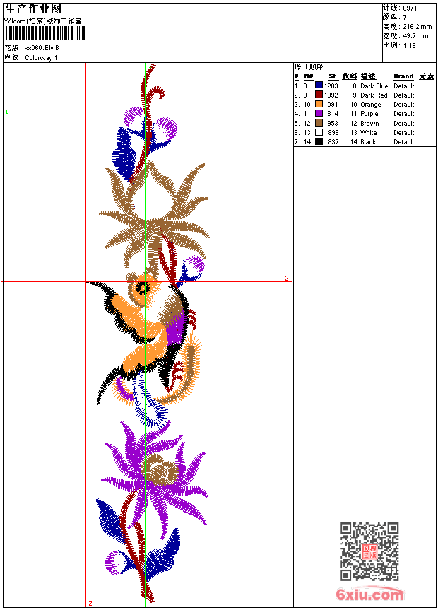 - emb花版参数: 大小:53.00 KB / 尺寸:50*216[毫米] / 针数:8971针 / 线色:7 / 格式:emb / 版本:9