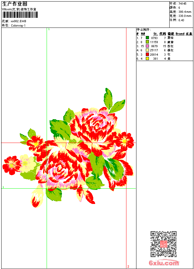 - emb花版参数: 大小:294.50 KB / 尺寸:330*300[毫米] / 针数:74145针 / 线色:6 / 格式:emb / 版本:9