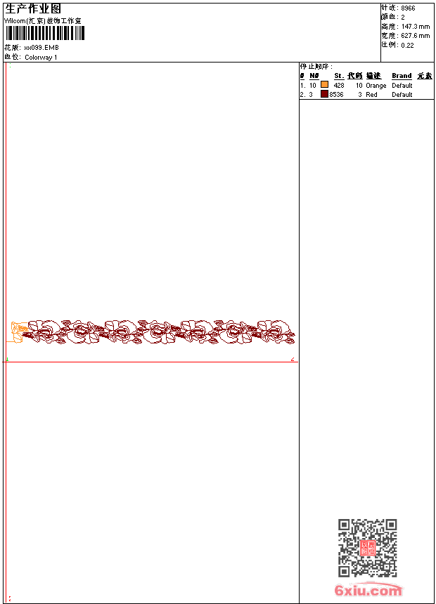 - emb花版参数: 大小:89.00 KB / 尺寸:628*147[毫米] / 针数:8966针 / 线色:2 / 格式:emb / 版本:9