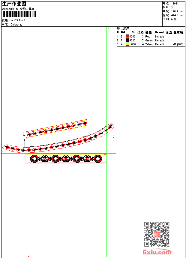 - emb花版参数: 大小:95.50 KB / 尺寸:445*176[毫米] / 针数:11013针 / 线色:3 / 格式:emb / 版本:9