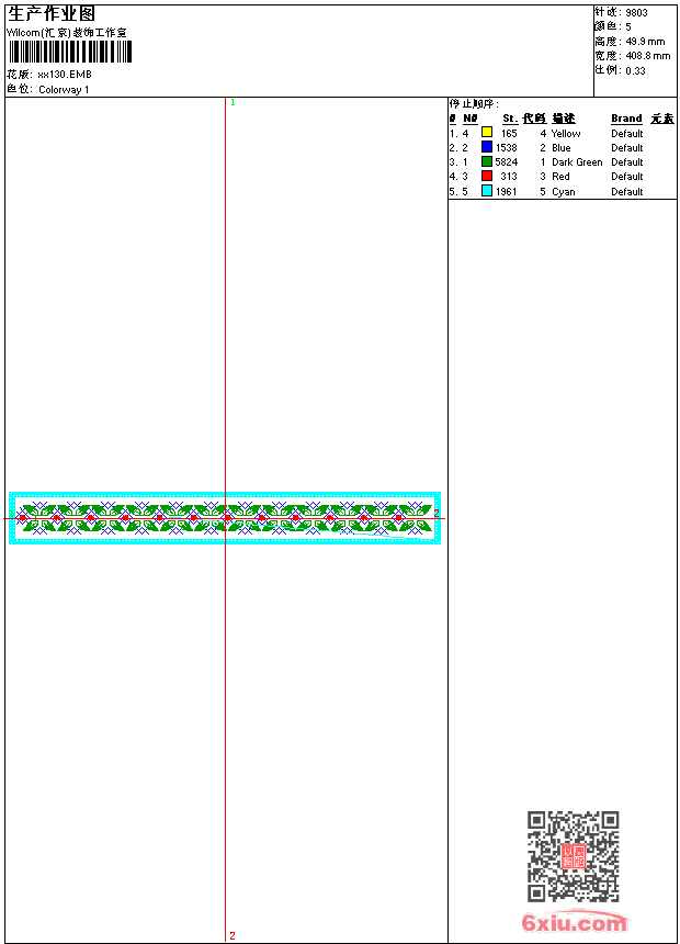 - emb花版参数: 大小:46.00 KB / 尺寸:409*50[毫米] / 针数:9833针 / 线色:5 / 格式:emb / 版本:9