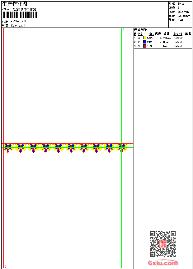 - emb花版参数: 大小:43.00 KB / 尺寸:338*26[毫米] / 针数:8942针 / 线色:3 / 格式:emb / 版本:9