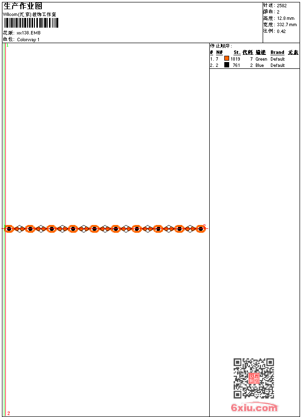 - emb花版参数: 大小:20.50 KB / 尺寸:333*13[毫米] / 针数:2582针 / 线色:2 / 格式:emb / 版本:9
