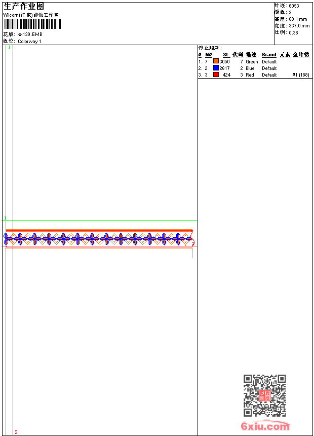 - emb花版参数: 大小:43.00 KB / 尺寸:337*68[毫米] / 针数:6093针 / 线色:3 / 格式:emb / 版本:9