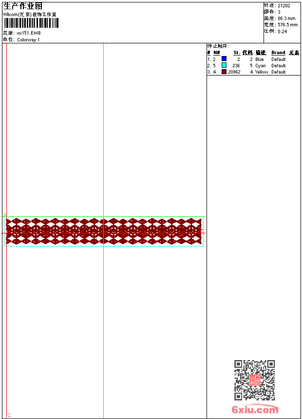 - emb花版参数: 大小:163.00 KB / 尺寸:577*86[毫米] / 针数:21202针 / 线色:3 / 格式:emb / 版本:9