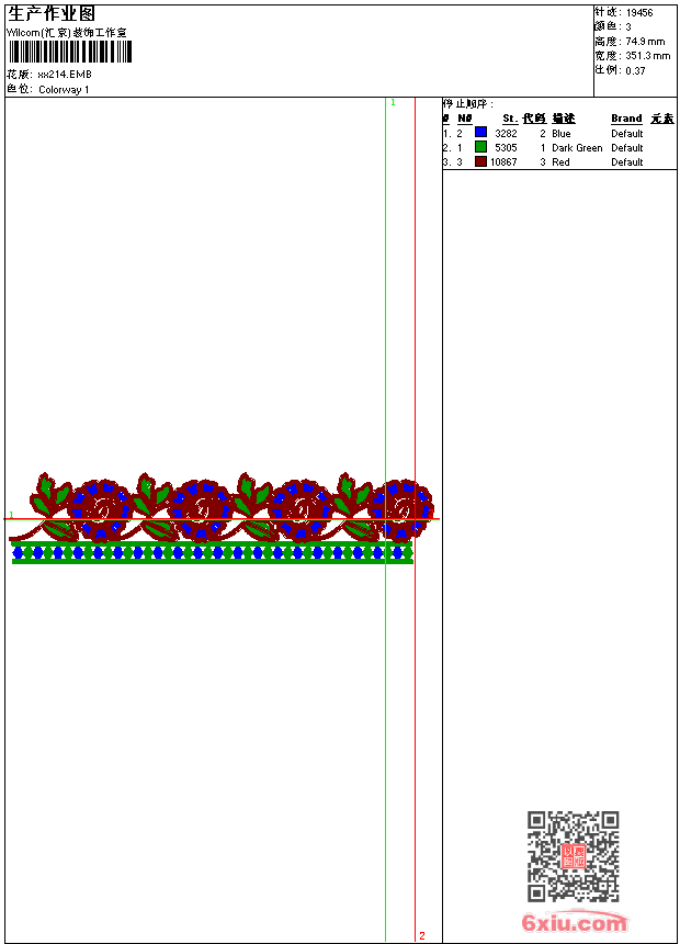 - emb花版参数: 大小:72.00 KB / 尺寸:351*75[毫米] / 针数:19456针 / 线色:3 / 格式:emb / 版本:9