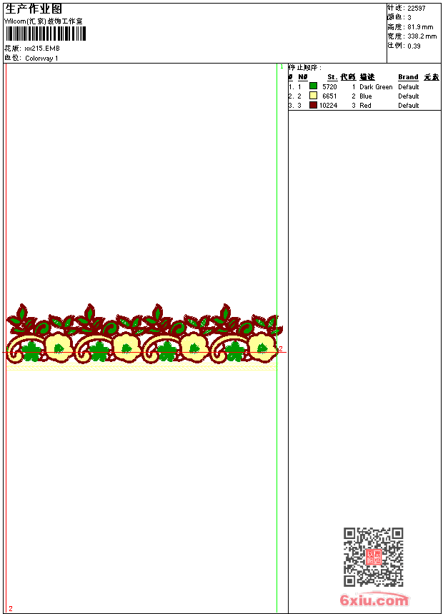 - emb花版参数: 大小:90.00 KB / 尺寸:338*82[毫米] / 针数:22597针 / 线色:3 / 格式:emb / 版本:9