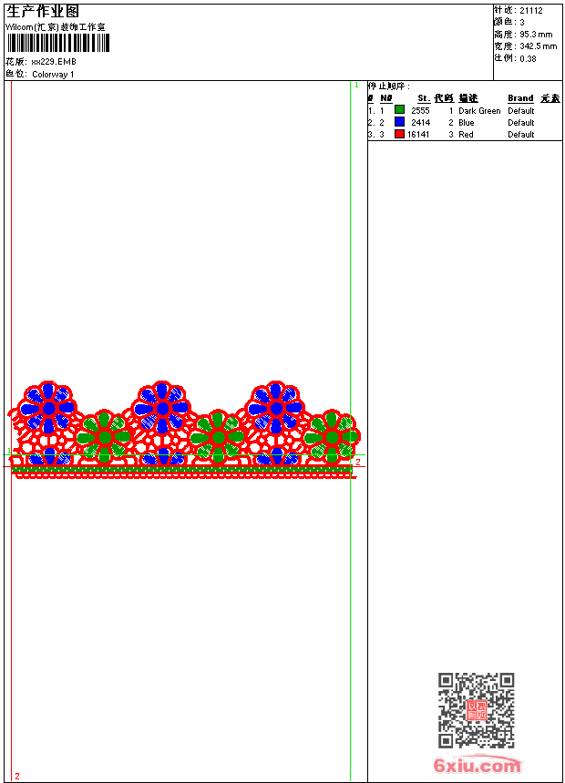 - emb花版参数: 大小:101.00 KB / 尺寸:343*95[毫米] / 针数:21112针 / 线色:3 / 格式:emb / 版本:9