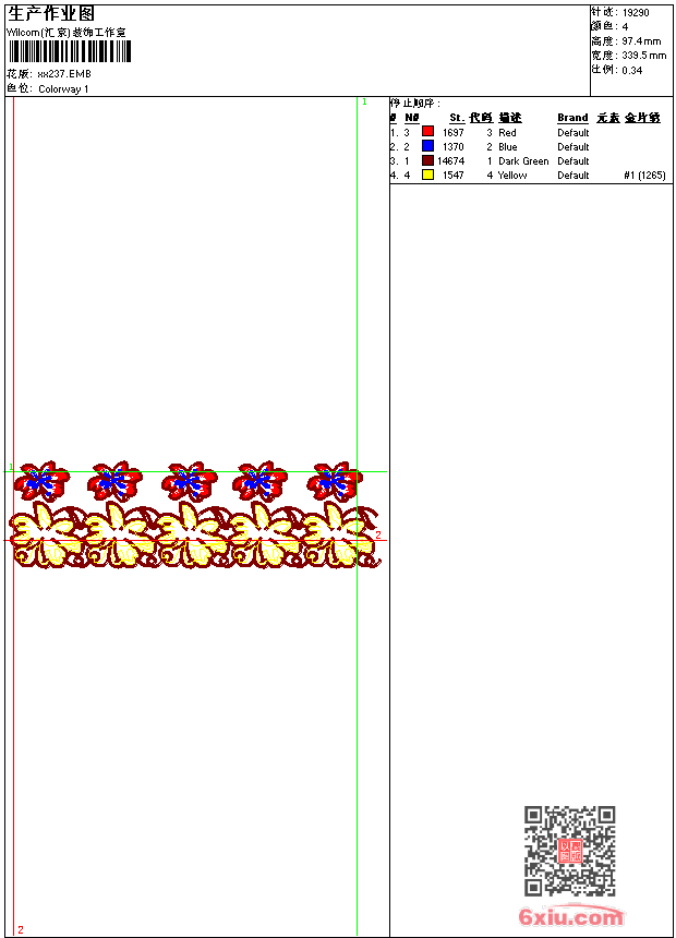 - emb花版参数: 大小:309.50 KB / 尺寸:340*97[毫米] / 针数:19290针 / 线色:4 / 格式:emb / 版本:9