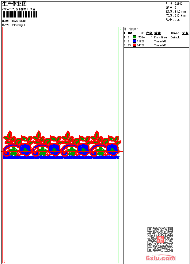 - emb花版参数: 大小:80.00 KB / 尺寸:338*81[毫米] / 针数:32862针 / 线色:3 / 格式:emb / 版本:9