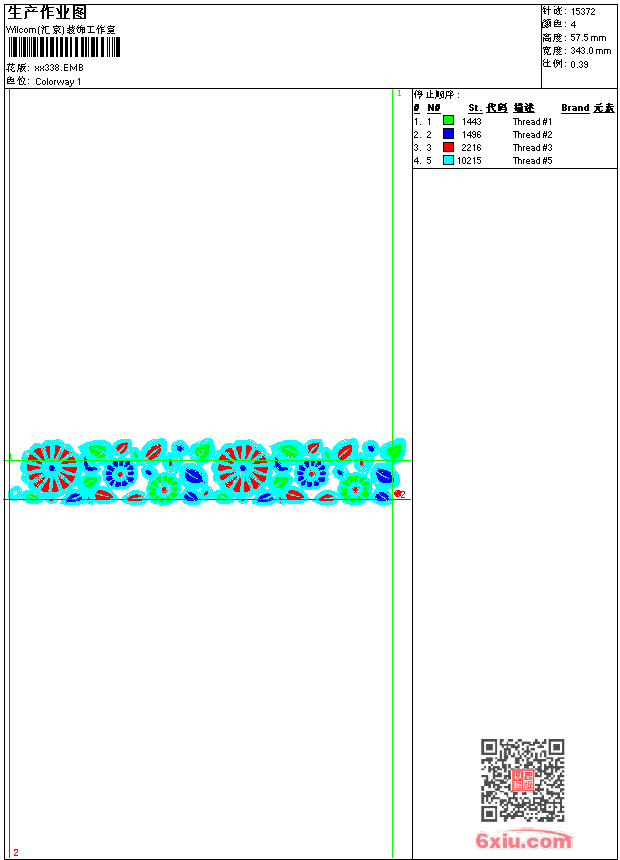 - emb花版参数: 大小:70.00 KB / 尺寸:343*57[毫米] / 针数:15372针 / 线色:4 / 格式:emb / 版本:9