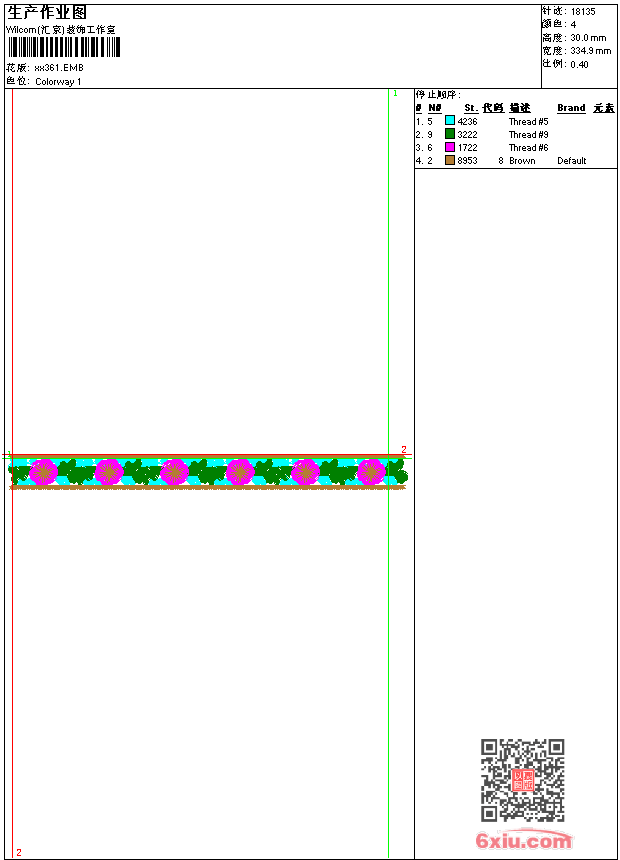 - emb花版参数: 大小:42.00 KB / 尺寸:335*30[毫米] / 针数:18135针 / 线色:4 / 格式:emb / 版本:9