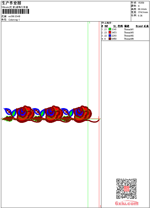 - emb花版参数: 大小:48.50 KB / 尺寸:375*66[毫米] / 针数:15359针 / 线色:4 / 格式:emb / 版本:9