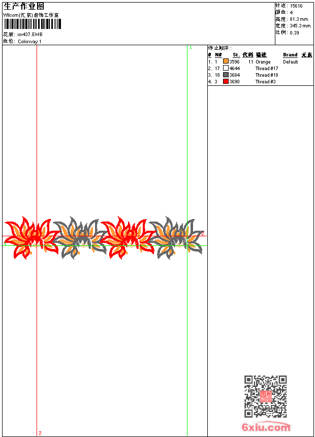 - emb花版参数: 大小:57.00 KB / 尺寸:345*81[毫米] / 针数:15616针 / 线色:4 / 格式:emb / 版本:9