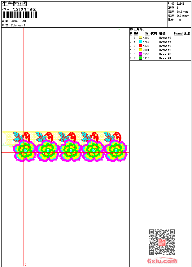 - emb花版参数: 大小:59.00 KB / 尺寸:363*89[毫米] / 针数:22866针 / 线色:6 / 格式:emb / 版本:9