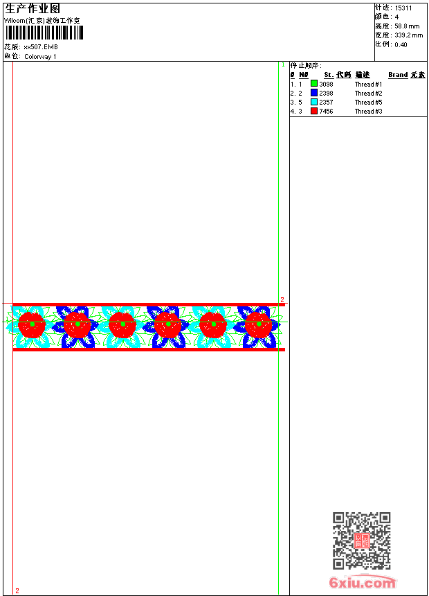 - emb花版参数: 大小:64.50 KB / 尺寸:339*59[毫米] / 针数:15311针 / 线色:4 / 格式:emb / 版本:9