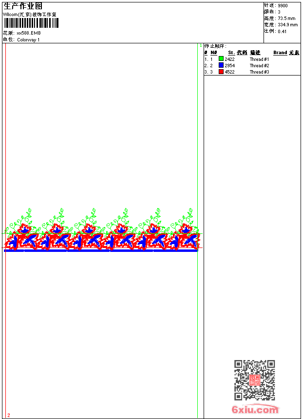 - emb花版参数: 大小:42.00 KB / 尺寸:335*73[毫米] / 针数:9900针 / 线色:3 / 格式:emb / 版本:9