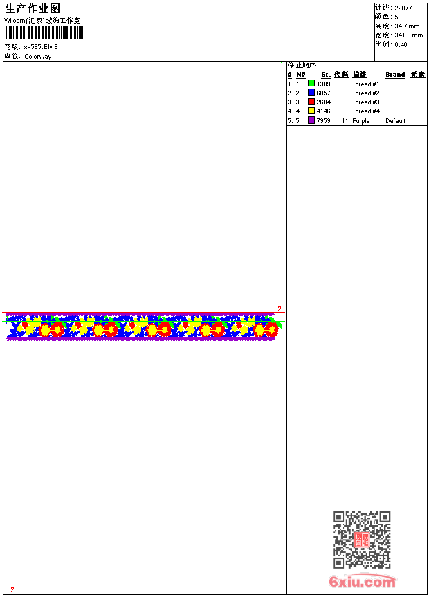 - emb花版参数: 大小:77.50 KB / 尺寸:341*35[毫米] / 针数:22077针 / 线色:5 / 格式:emb / 版本:9