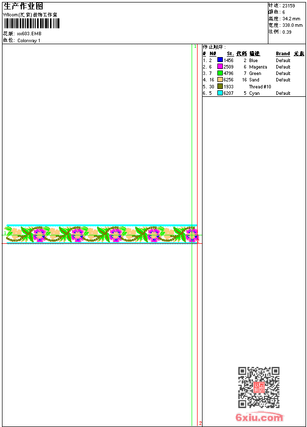 - emb花版参数: 大小:84.00 KB / 尺寸:338*34[毫米] / 针数:23159针 / 线色:6 / 格式:emb / 版本:9