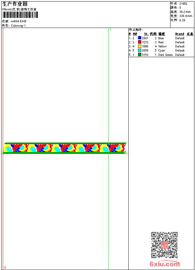 - emb花版参数: 大小:64.50 KB / 尺寸:338*30[毫米] / 针数:21952针 / 线色:5 / 格式:emb / 版本:9