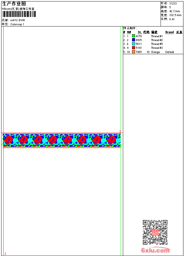 - emb花版参数: 大小:73.00 KB / 尺寸:333*43[毫米] / 针数:31233针 / 线色:5 / 格式:emb / 版本:9